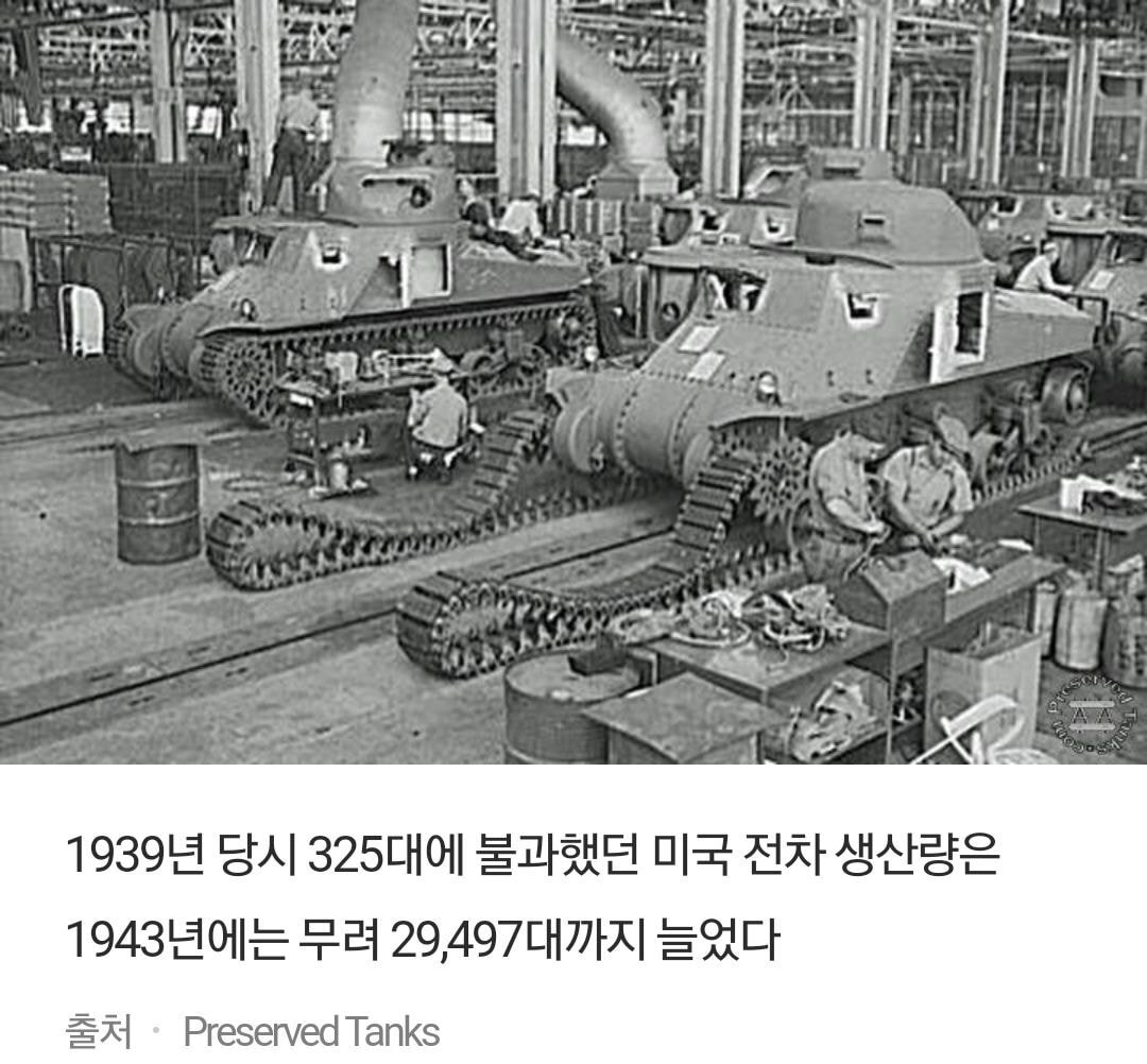 영국이 미국에게 전수한 당시의 최첨단 기술력과 미국의 거대한 생산력이 결합하면서 1943년부터 미국은 완전한 전시체제로 돌입했어. 총력전이 무엇인지를 제대로 보여주는 미국과 그들의 생산력은 우리의 상상 그 이상이었어. 풀빵 찍어내듯이 무기와 군수물자 등을 생산하는데, 그 양이 전세계 군수물자의 40%였다고 해.